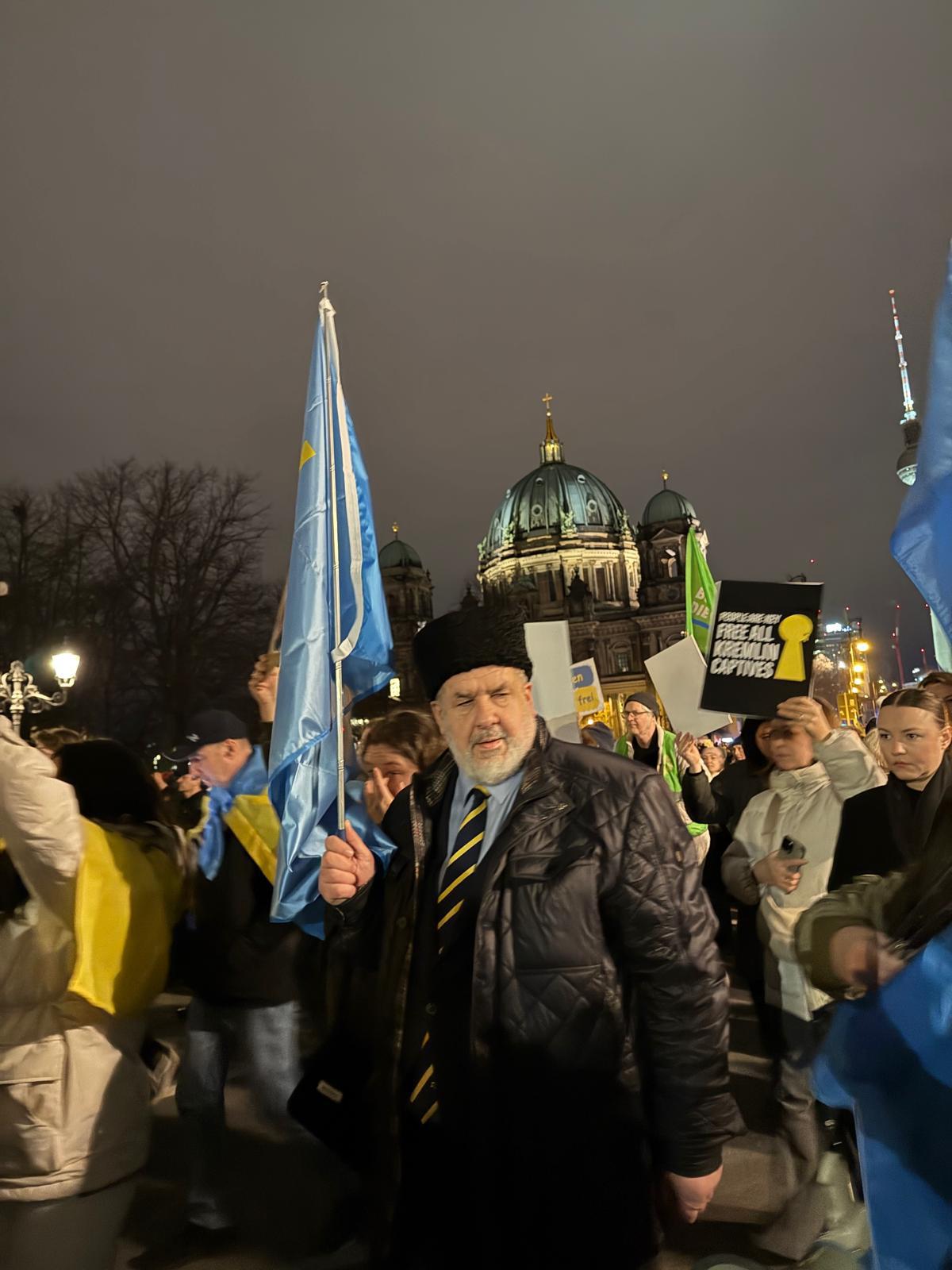 Berlin programı kapsamında heyet daha sonra Alman Federal Parlamentosu’nu ziyaret etti ve çeşitli temaslarda bulundu. Savaşın dördüncü yılı dolayısıyla Berlin’de düzenlenen yürüyüşe katılan Çubarov burada bir konuşma yaptı. Gösteride konuşan Ukrayna’nın Berlin Büyükelçisi Oleksii Makeiev, Almanya’nın Ukrayna’ya verdiği desteğe özellikle teşekkür ederek Almanya’nın artık Ukrayna’nın en önemli destekçisi konumunda olduğunu söyledi. Geçtiğimiz yıl ilk kez Alman yatırımlarının Ukrayna savunma sanayisine ulaştığını belirten Makeiev, Alman desteği sayesinde Rusya’nın derinliklerindeki hedeflere ulaşabilen insansız hava araçları üretildiğini ifade etti. Miting boyunca daha fazla silah desteği çağrıları hem sahneden hem de katılımcılar arasından dile getirildi. Berlin Eyalet Başbakanı Kai Wegner ise 2023’te Kiev ile imzalanan şehir ortaklığını hatırlatarak “Kiev’in gelecekte özgür bir şehir olacağına ve Ukrayna’nın özgür bir ülke olarak kalacağına yürekten inanıyoruz” dedi.